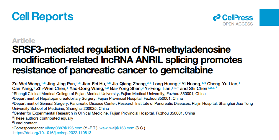 在田毅峰教授指导下,肝胆胰外科陈实教授课题组的最新研究成果,近日正式发表于国际学术期刊《Cell》权威子刊《Cell Reports》(中科院1区JCR1区),论文题为“SRSF3-mediated regulation of N6-methyladenosine modification-related lncRNA ANRIL splicing promotes resistance of pancreatic cancer to gemcitabine”,这是今年陈实课题组继在Journal of Experimental & Clinical Cancer Research(中科院1区,IF:12.66)和frontiers in immunology (JCR1区)发文后的又一力作。