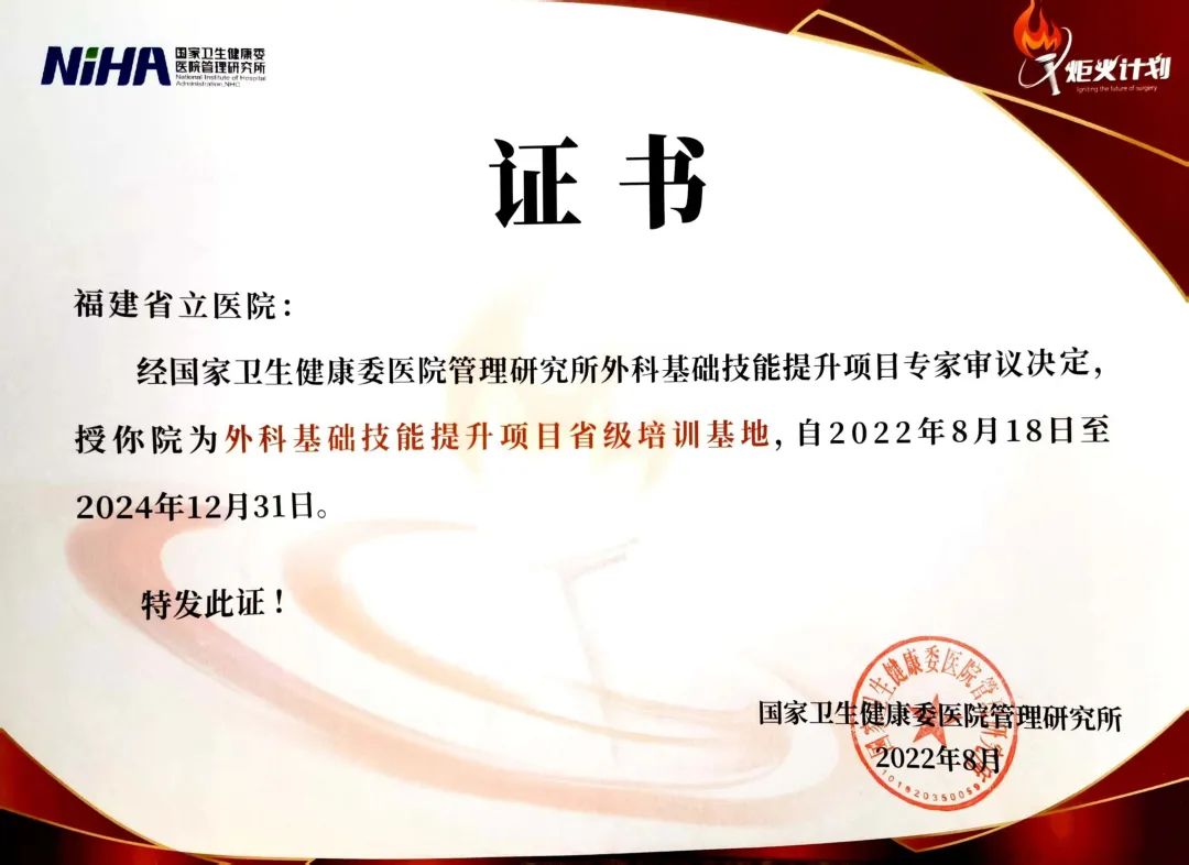 近日,在国家卫生健康委医院管理研究所召开的首届“中国医疗质量大会”上,颁发了首批“外科基础技能提升项目培训基地”证书。经层层审核,福建省立医院骨科、普外科、心脏外科、神经外科四个专业成功入选首批国家卫生健康委医院管理研究所外科基础技能提升项目省级培训基地,我院副院长、外科教研室主任徐杰教授担任基地负责人。